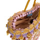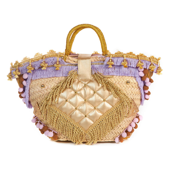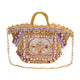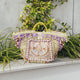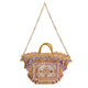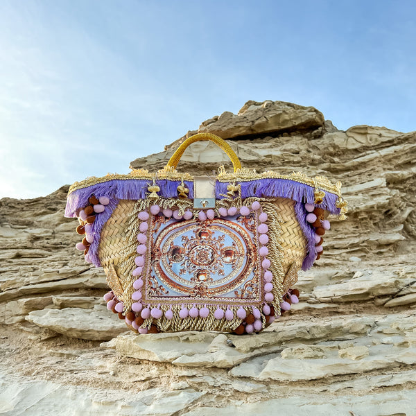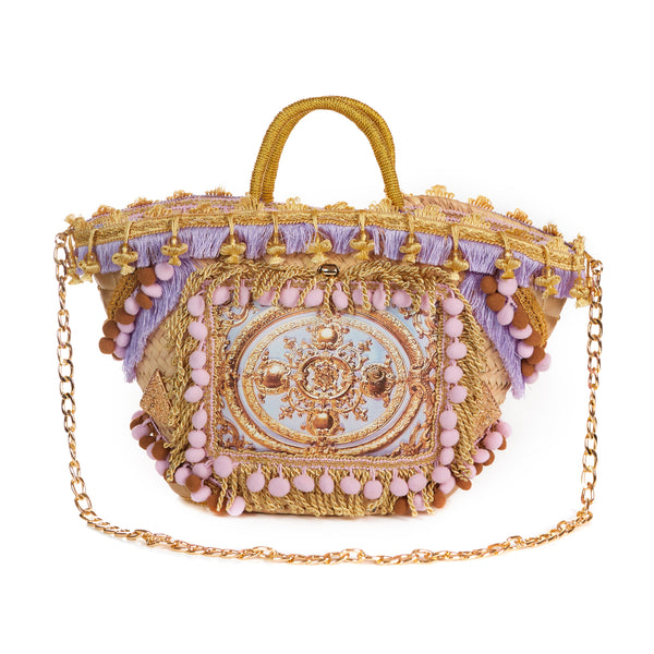 This handmade bag is made with palm leaves in Morocco, hand embroidered with transparent thread with carefully selected high quality decorations. The back of the bag is closed with eco-leather stitching so that the straw part does not leave puffs on clothes, the front of the bag is decorated with an authentic print of details of the Palace of Versailles on eco-leather, which makes it more luxurious and exclusive. The bag is closed with a strap and a clasp, and the upper part of the silk lining is also tightened with a cord. There are 2 pockets inside. The set includes a removable shoulder strap - chain.