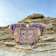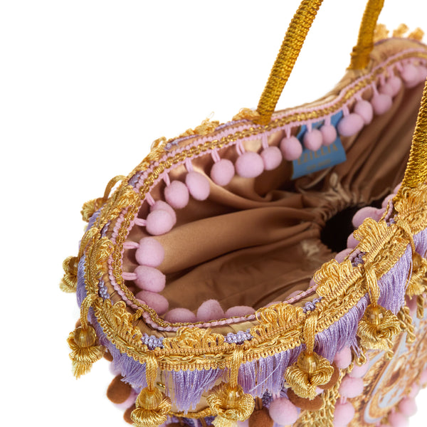 It has print on eco-leather in the style of Baroque era in purple-gold colors.